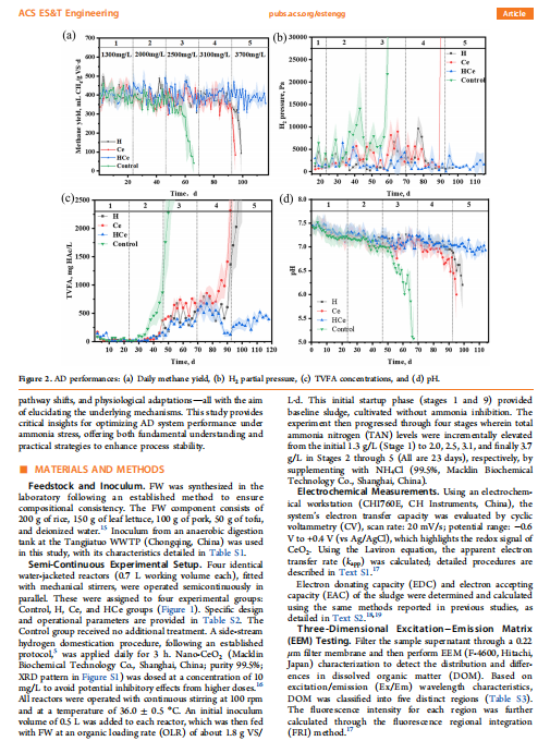【文献标题】CeO2 and Side-Stream Hydrogenation Domestication Synergistically Mitigate Ammonia Inhibition in Food Waste Anaerobic Digestion: Insights into Microbial Metabolism and System Stability